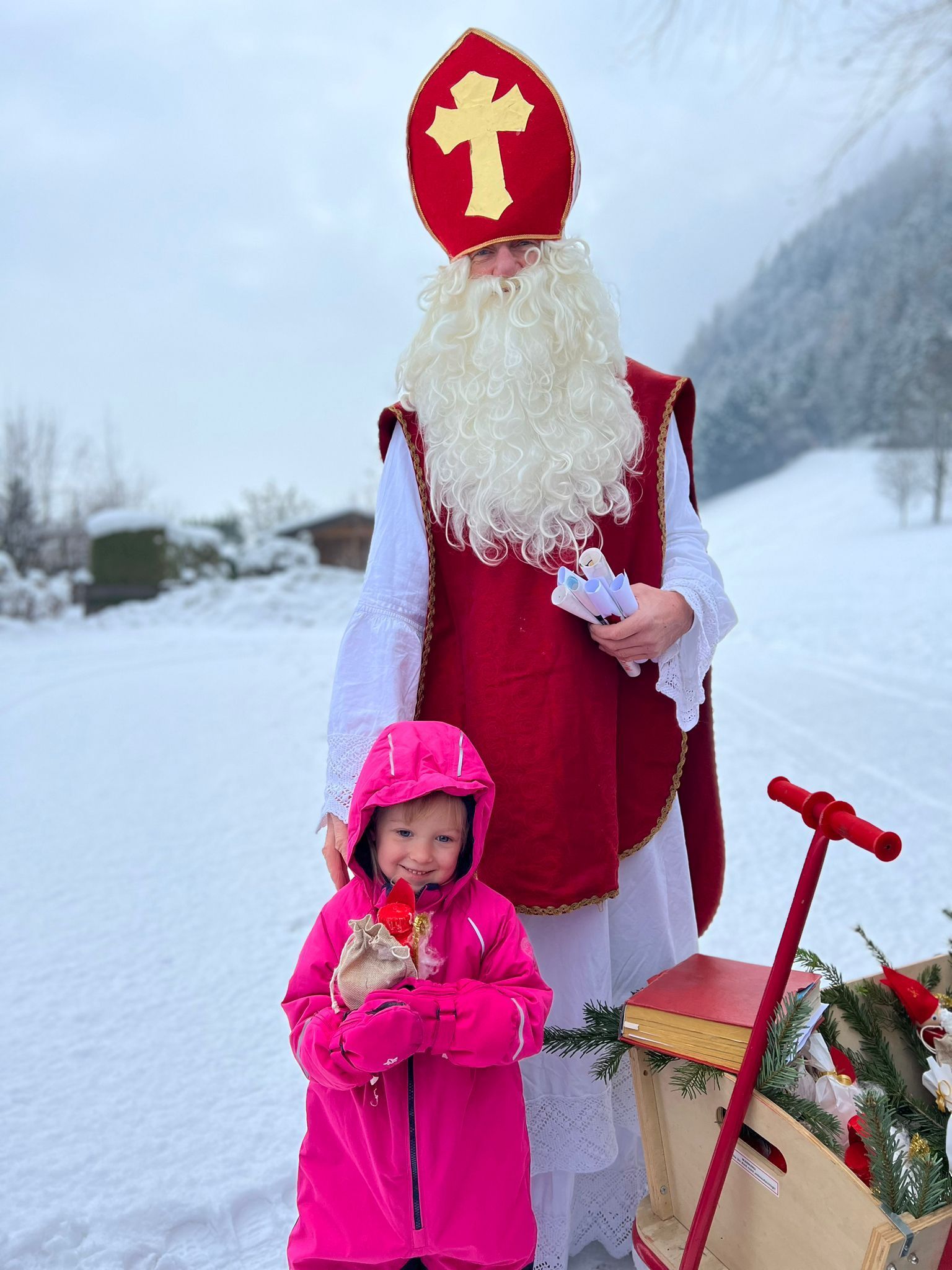 Auf der Suche nach dem Nikolaus sind wir bis zum Waldesrand gekommen! Dor ist uns der Nikolaus schon entgegengekommen und hat uns begrüßt! Kurz erzählte er uns etwas über unsere Gruppe und was er besonders an uns fand! Natürlich haben wir dem Nikolaus auch etwas vorgesungen. Als Überraschung überreichte er unsere selbstgebastelten Nikolaus-Rasseln, welche er am Vortag schon im Kindergarten abgeholt hat. ALs kleines Geschenk befüllte er unsere Säckchen mit Nüssen, Mandarinen und natürlich Schokolade. Im Anschluss genossen wir im Kindergarten unsere Nikolaus-Jause.