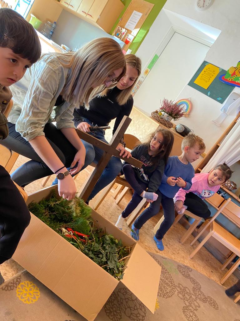 Zudem bekamen wir Besuch von den Jungbauern aus Radfeld. Sie banden gemeinsam mit den Kindern ein Erntedankkreuz für den Radfelder Erntedankwagen.